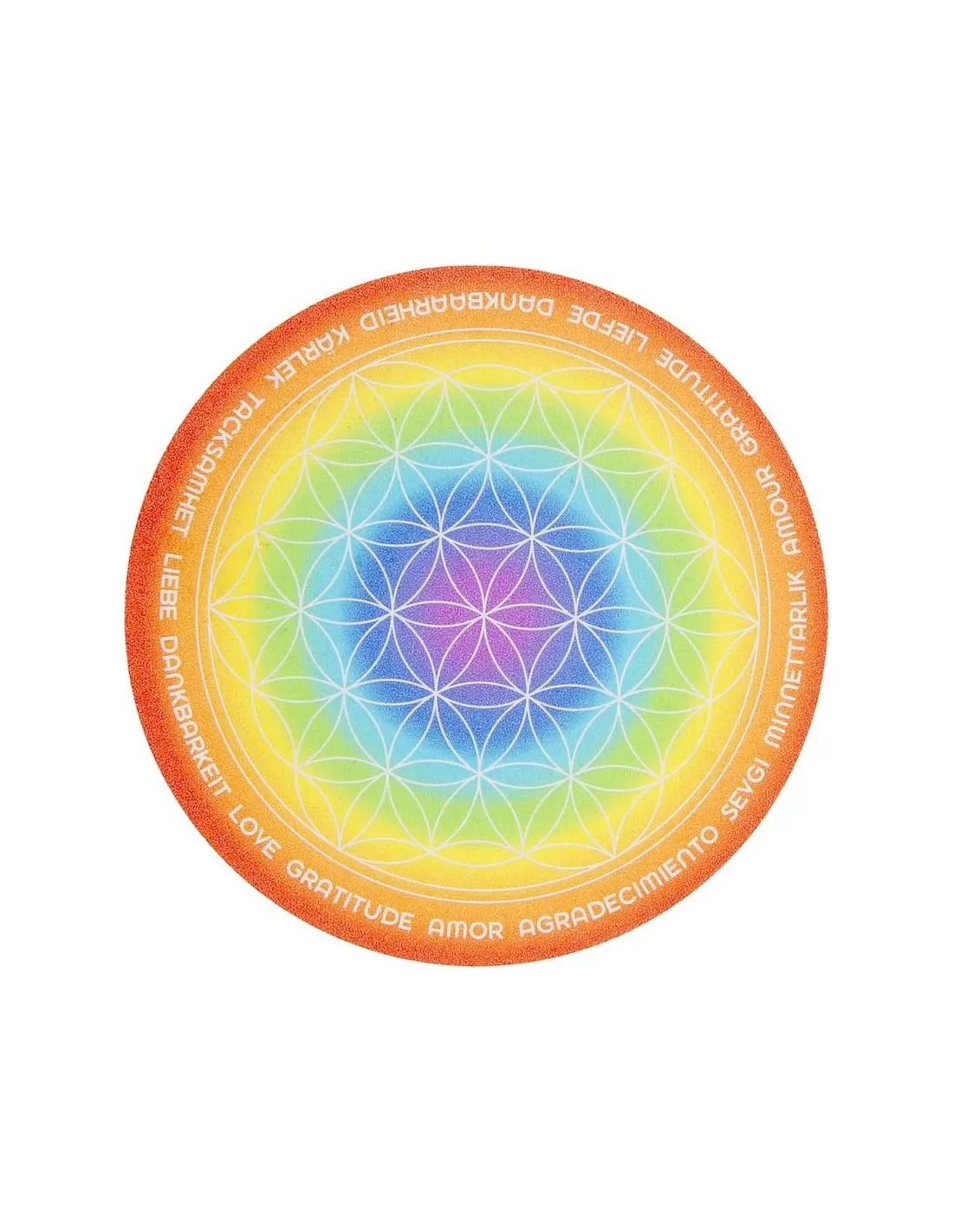 "Livets Blomst" Underlagssæt bruges til at informere og energisere drikkekopper med vand og mad. Sættet indeholder syv brikker i chakrafarver og én ekstra i regnbuefarver. Brikkerne har en diameter på 9,5 cm og motivet "Livets Blomst" med teksten "Kærlighed og Taknemmelighed" på 6 sprog. Dette sæt med 8 brikker er en god ledsager til at informere vand og fødevarer positivt. Køb "Livets Blomst" Underlagssæt nu og informer dit drikkevand.