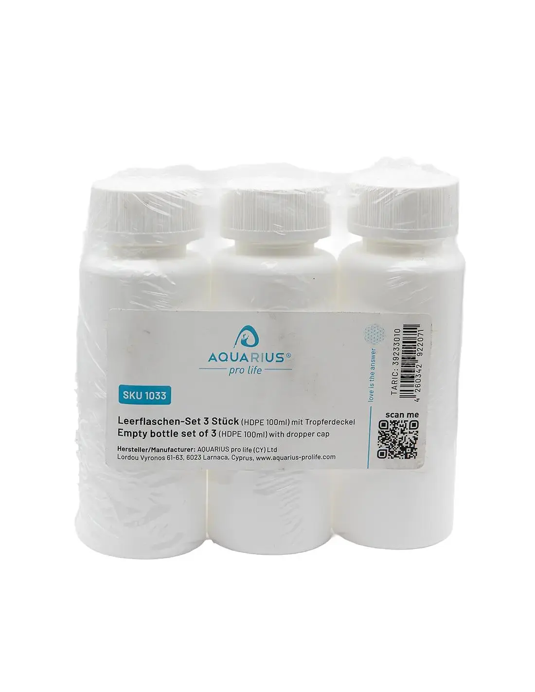 Set of 3 empty 100 ml HDPE bottles with dropper caps